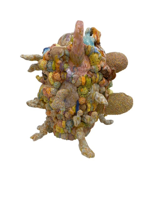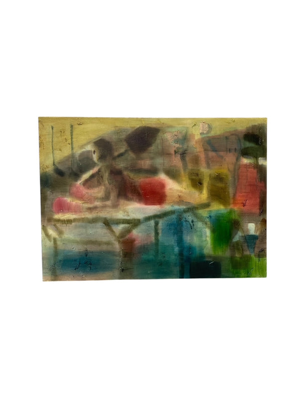 にじみやぼかしを意図的に取り入れた画面の中でかたちの境界は曖昧に揺らぎ、アクリル絵具の鮮やかな発色とともに、判然としない夢のような世界を生み出しています。